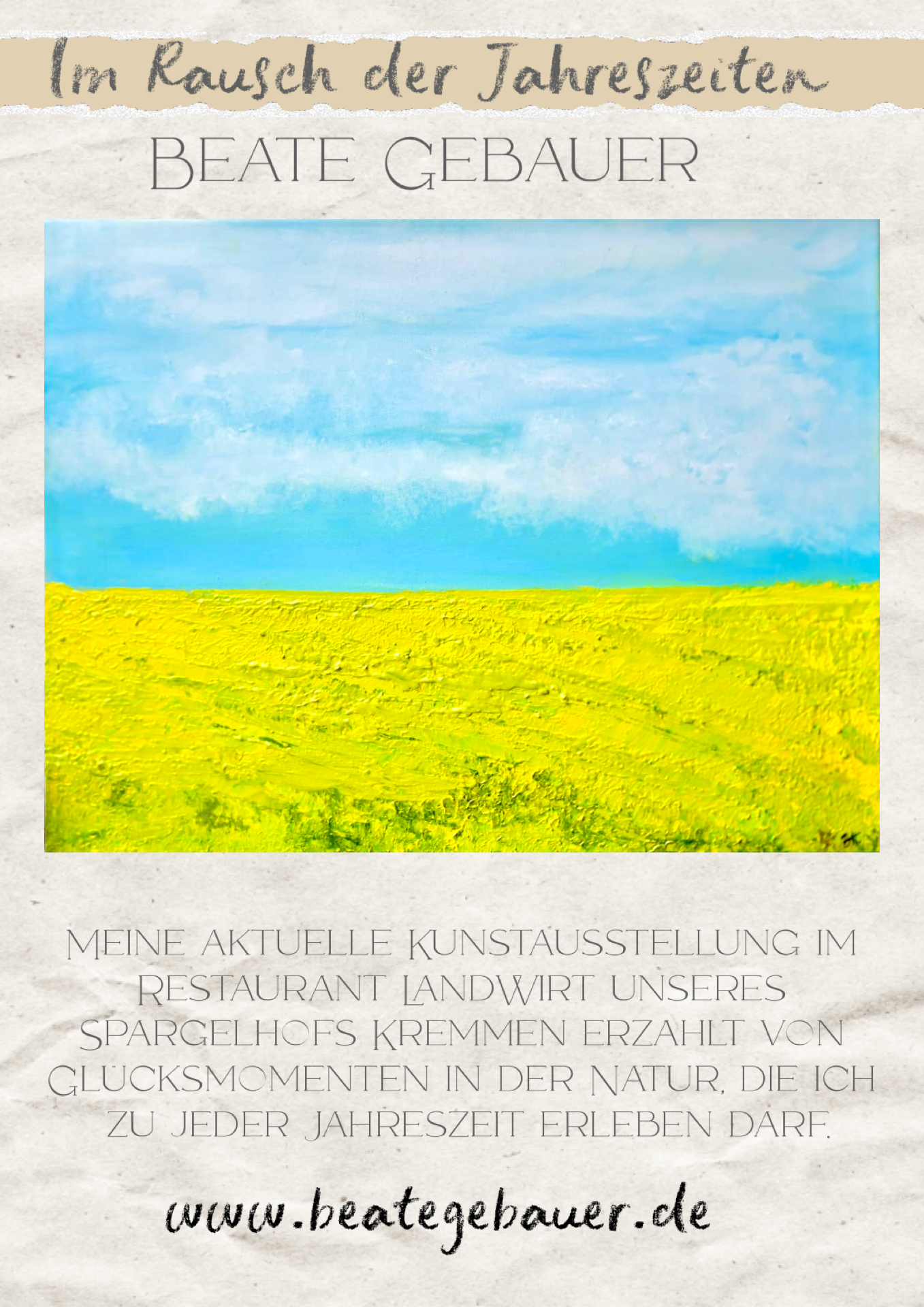 Hier an meiner beruflichen Wirkungsstätte, auf unserem schönen Spargelhof Kremmen, stelle ich meine Bilder besonders gern aus. Denn sie entstehen abseits vom oft sehr intensiven und lebendigen Hofalltag in meinem heimischen Atelier am Krämerwald oder im sonnigen Garten. Somit stehen sie für mich auch als Symbol für innere Einkehr, Reflexion und eine gesunde Balance. So ist der Titel dieser Ausstellung durchaus doppeldeutig zu verstehen. Rauschen die vier Jahreszeiten doch allzu oft mit Vollgas an uns vorbei und wir stellen verwundert fest, wo all die Jahre geblieben sind. Die Schönheit einer jeden Jahreszeit ganz bewusst wahrzunehmen und zu genießen – dazu möchte ich hiermit auf das herzlichste einladen.