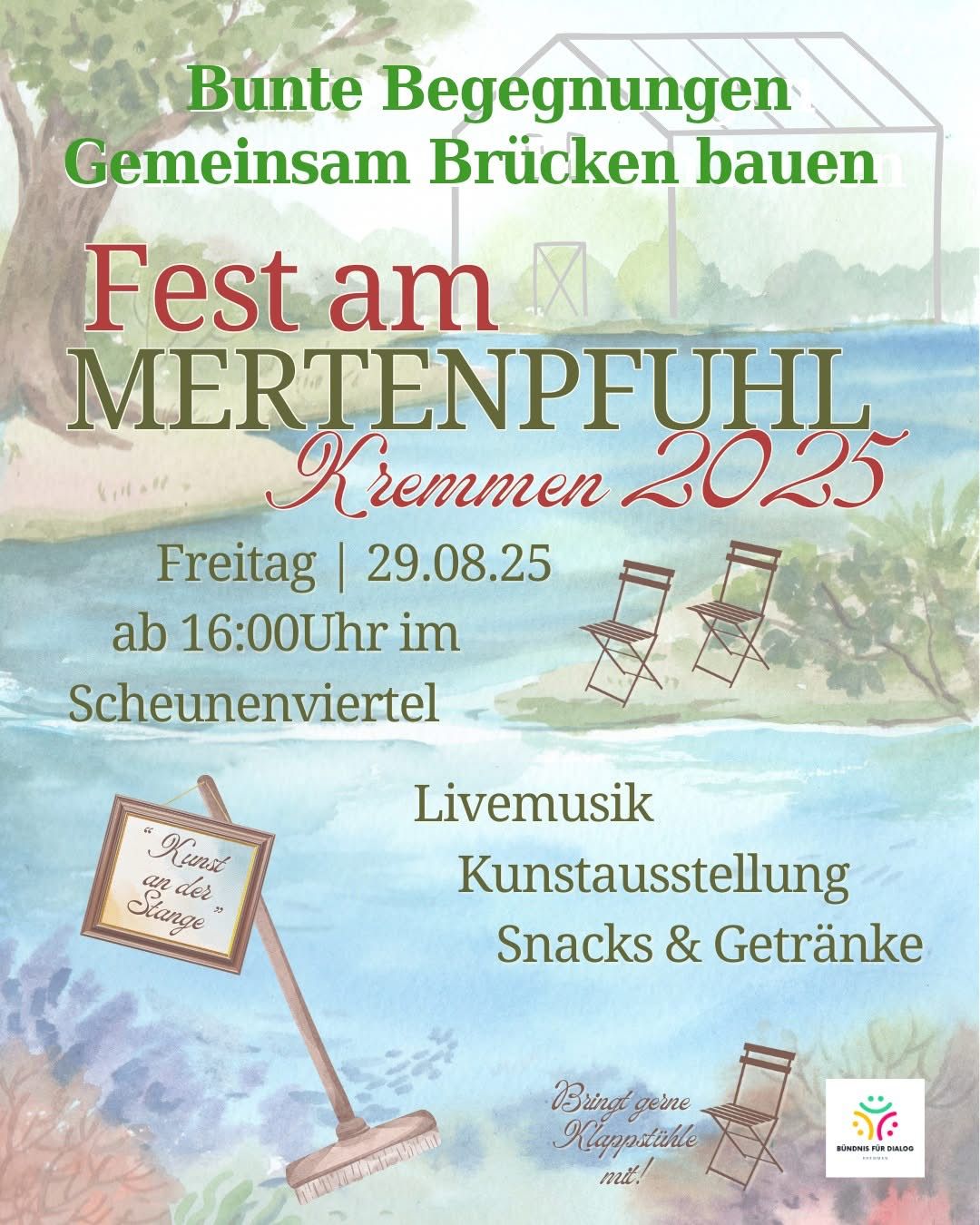 Im historischen Scheunenviertel verabschieden fünf Künstlerinnen gemeinsam mit dem Scheunenviertelverein Kremmen e.V. mit einem schönen kleinen Fest den Sommer. Neben Livemusik, Snacks und Getränken zeigen wir Künstler heute Kunst an der Stange. Bei guten Wetter holen wir unsere kleinen Bilder heraus und bauen an Stangen und Seilen rund um dem Mertenpfuhl herum eine Kunstausstellung der anderen Art auf. Wir bieten die kleinen Formate bewusst zu günstigen Preisen an, um auch Liebhabern mit einem kleineren Budget die Chance für ein tolles Kunstwerk aus der Heimat zu bieten. Wir freuen uns auf regen Besuch und ein geselliges Fest.