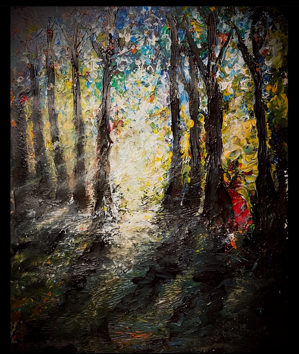 Ein Sommermorgen im Wald, der Tag wird heiß und die Luft beginnt schon zu flirren, doch noch kühlt der Tau uns ein wenig. Der expressive Stil dieses Bildes lässt dem Betrachter Spielraum für eigene Interpretationen, steht da ein Mädchen im roten Kleid hinter einem Baum?
